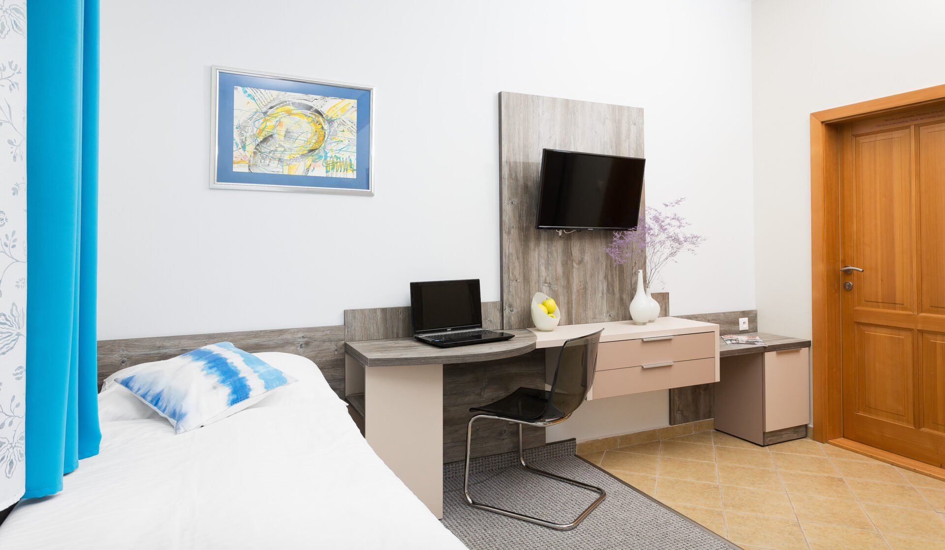 Spacious non-smoking single rooms with an area of 15 m2 overlooking the garden. They are equipped with a work desk, coffee and tea service. They have their own bathroom with shower, toilet and hairdryer. All rooms feature air conditioning. Slippers, shoehorn, shoe sponge, brush for cleaning clothes, laundry bag are available to guests as well.
